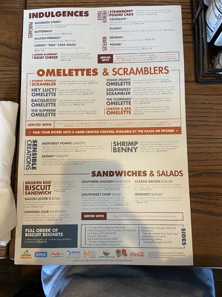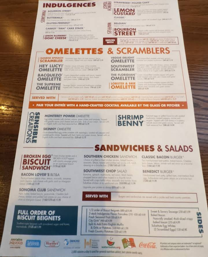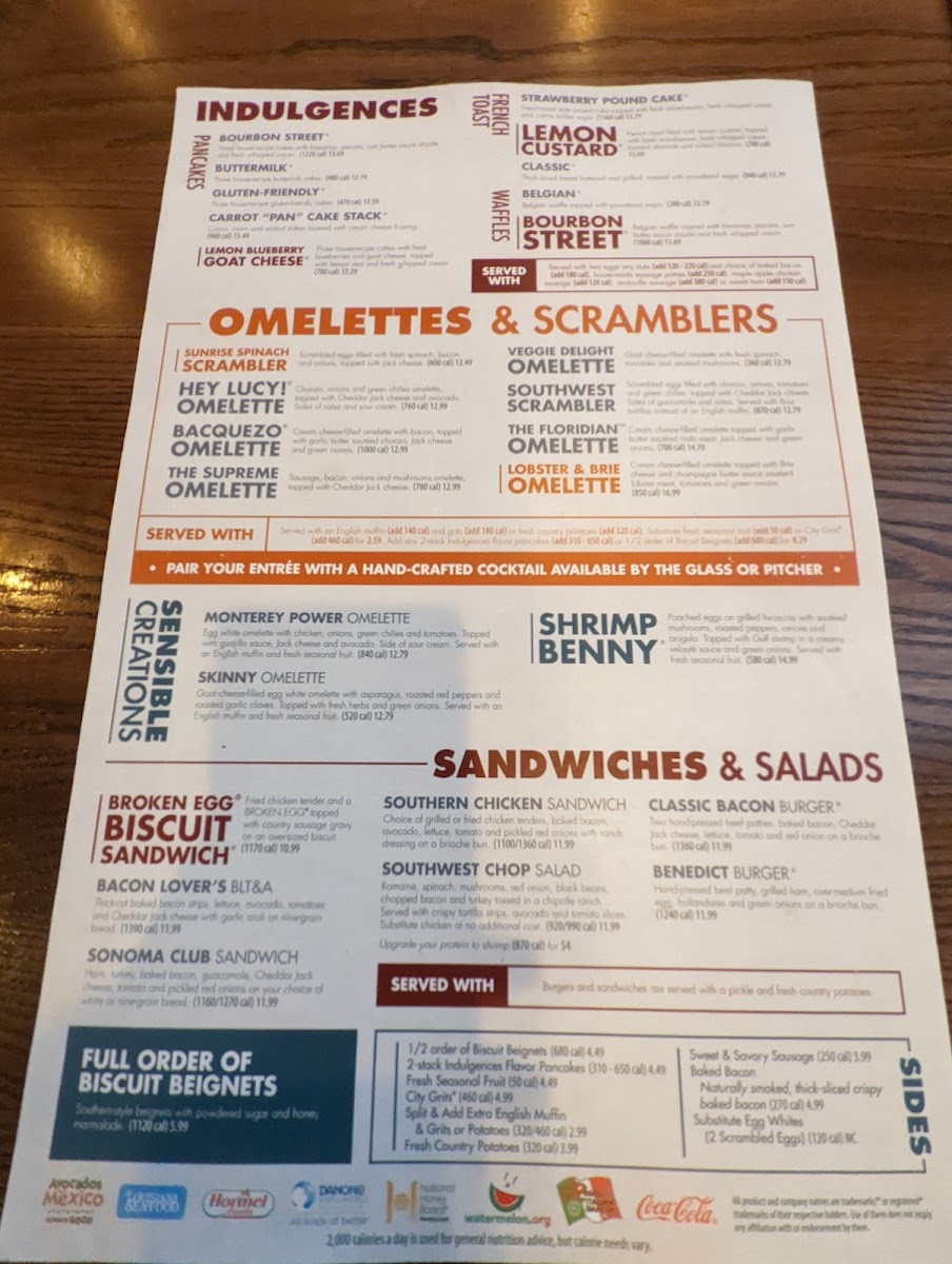 Scrambled eggs filled with country ham, onions and tomatoes over Cheddar Jack cheese grits. Topped with country sausage gravy. Served with baked bacon and an over-sized biscuit. (1370 cal) Pair with an Abita Amber Lager (130 cal) and Rwanda Single-Origin Coffee (0 cal).